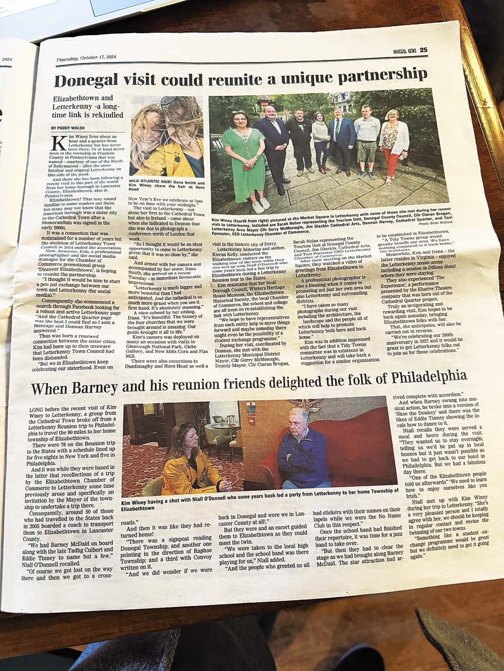 "Donnan's a visionary and a doer," Winey said. "While we were there, I was given an official greeting and handshake on the square from the mayor and several Letterkenny leaders. I wasn't in a position to sign anything, of course, but it felt like we were giving new life to the cause. After the meeting, I shared a video of greetings from a few Elizabethtown leaders, including Mayor Mummert, who was also one of the original memorandum signers."