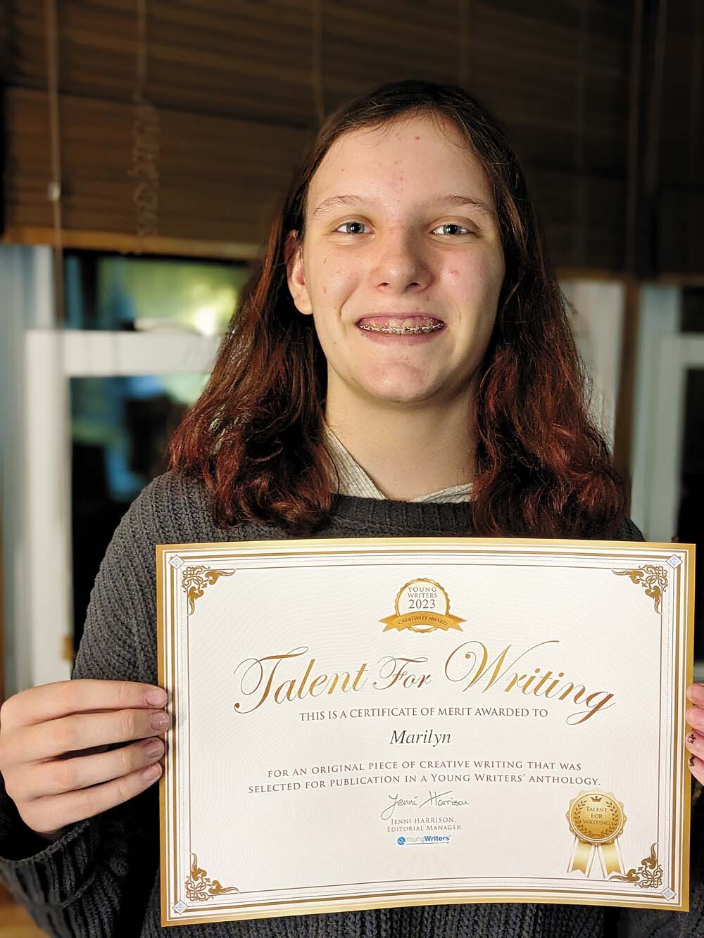 "Marilyn is a gifted student who thinks deeply and writes creatively," Hosler said. "Through the writing process, Marilyn was open to suggestions that sharpened her focus and message. Her word choice is outstanding, creating an atmosphere of suspense and fear in just 100 words."